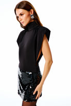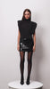ALTHERIA Collection | Yüksek yaka, vatkalı omuz detaylı mini elbise. Parlak payet işlemeli etek.