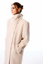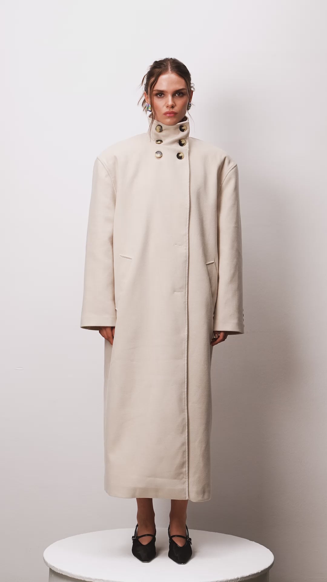 The Office Drop | Dik yaka, uzun kollu, kol ağzı düğmeli kaban. Aynı kumaştan yaka aksesuarı ve uyumlu renkte iç astarlı. Önü düğmeli.