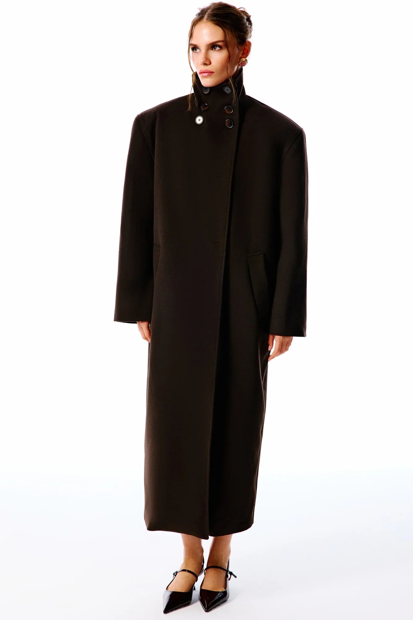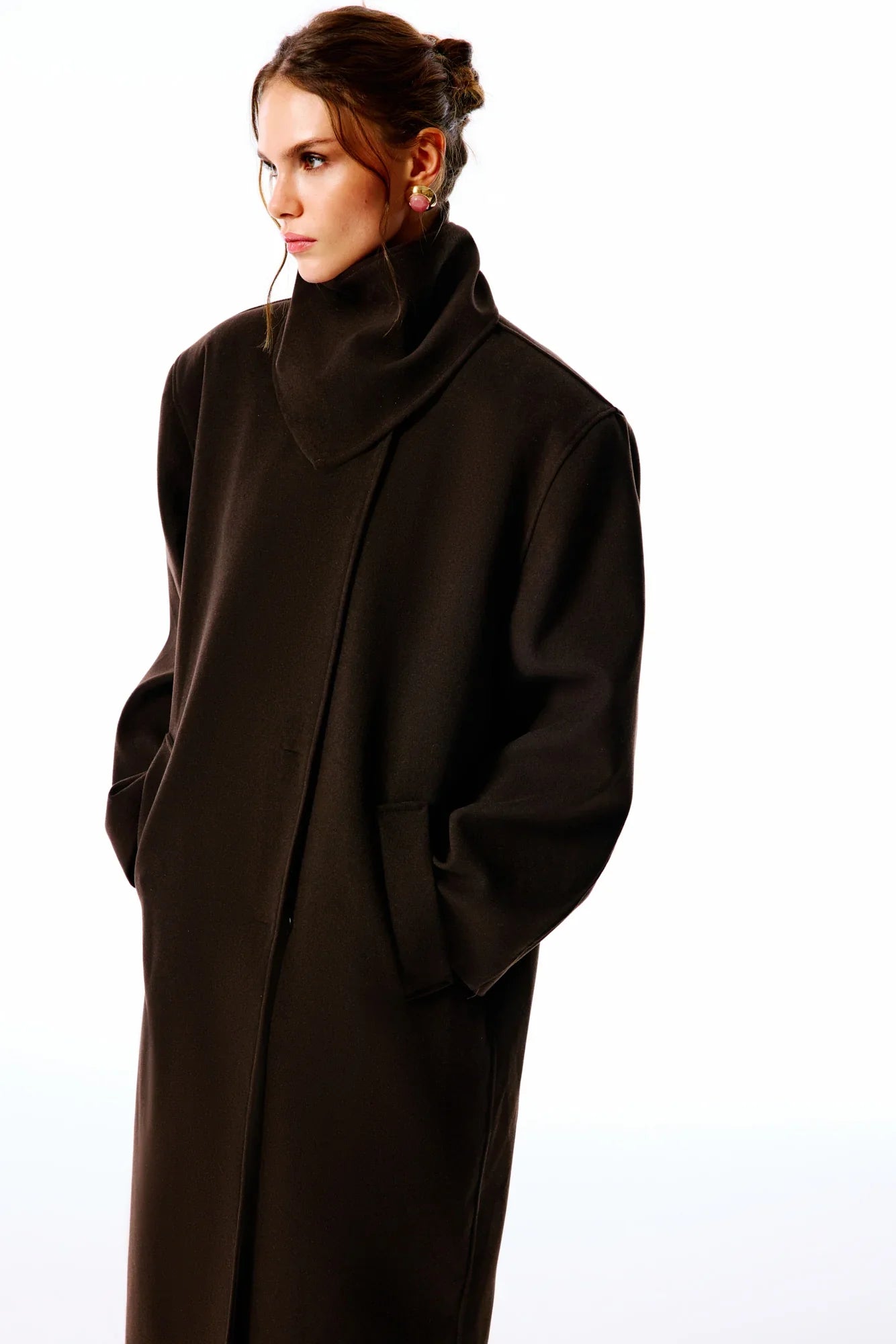 Office Drop | Dik yaka, uzun kollu, kol ağzı düğmeli kaban. Aynı kumaştan yaka aksesuarı ve uyumlu renkte iç astarlı. Önü düğmeli.