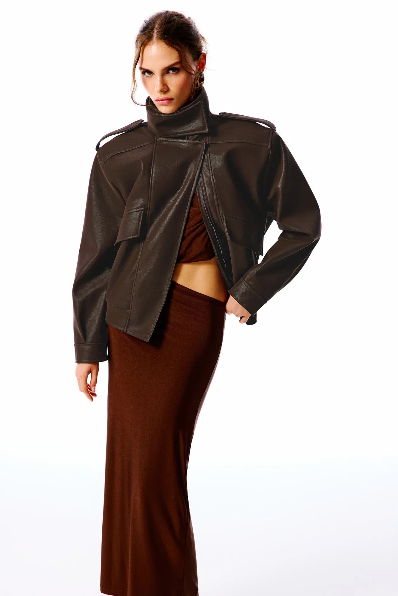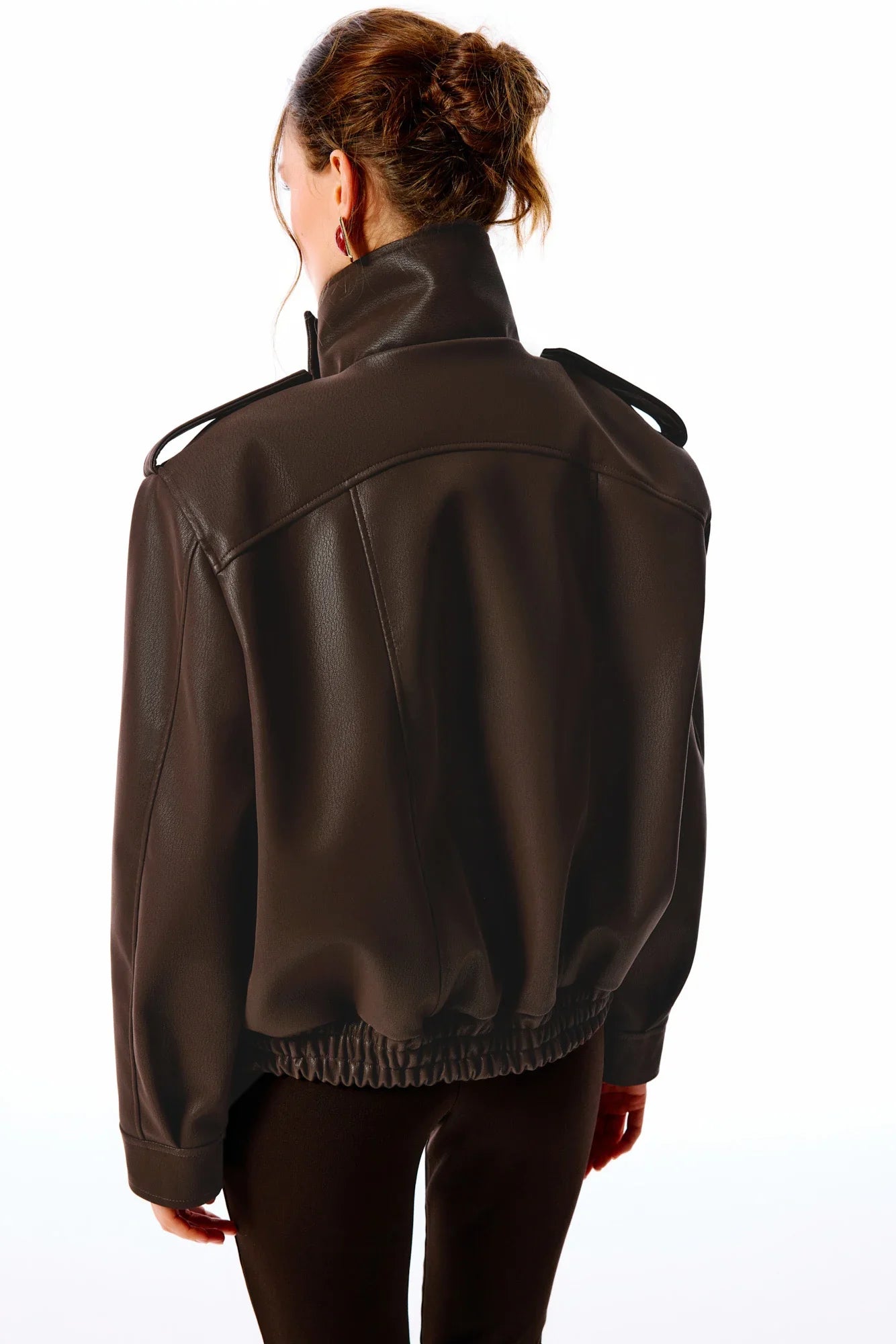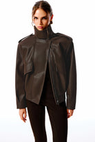 The Office Drop | Yüksek dik yakalı, uzun kollu deri ceket. Önden fermuarlı kapamalı. Kapaklı yan cepli. Omuzlarda apolet detaylı. Arka kısmı lastikli.