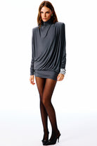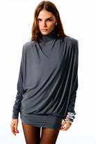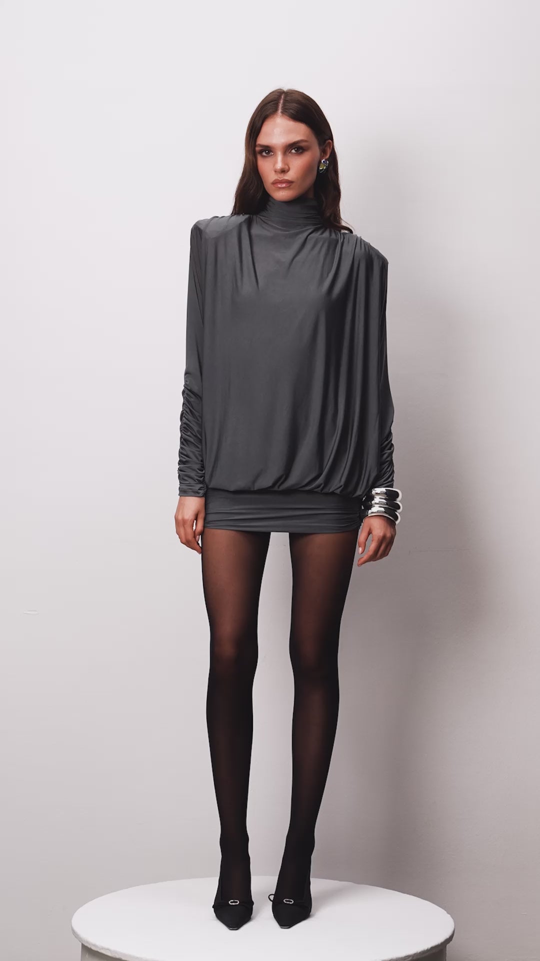 ALTHERIA Collection | Dik yaka, vatkalı, yarasa kollu ve sırtı açık bluzan düşük mini elbise.