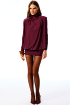 Rendez-Vous Collection | Dik yaka, vatkalı, yarasa kollu ve sırtı açık bluzan düşük mini elbise.