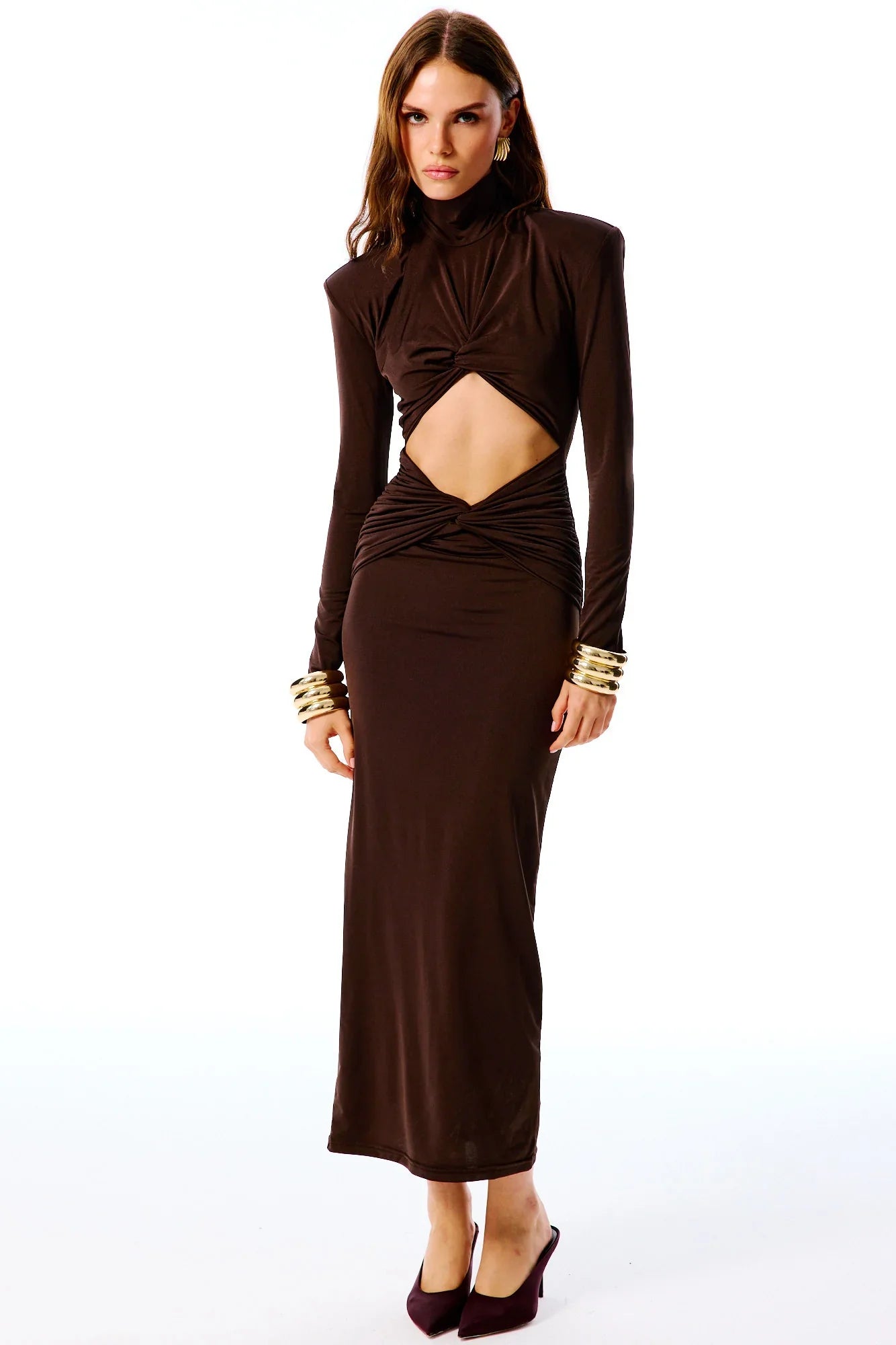 Allure Collection | Uzun elbise. Dik yaka, vatkalı ve uzun kollu. Yanlardan drapeli kumaştan ve göğüs kısmı düğümlü. Beli pencere detaylı. Dikişe gizli arka fermuarlı.