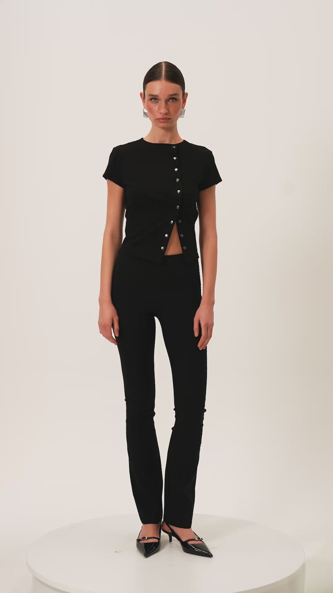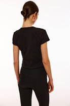 x Melodi Elbirliler | Kısa kollu üst. Bisiklet yaka. Ön kısmı metal çıtçıt detaylı, asimetrik kapama ve hafif dekolte görünümü sunar. Vücuda oturan formdadır.