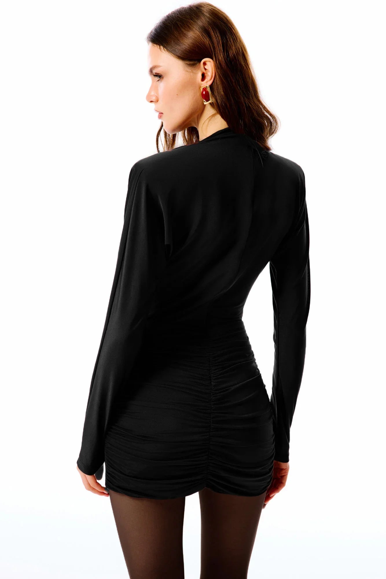 ALTHERIA Collection | Asimetrik kesim detaylı, uzun kollu mini elbise. Ön kısmı cut-out dekolteli ve drapeli. Etek kısmı büzgü detaylı, arka kısmı düz kesim.