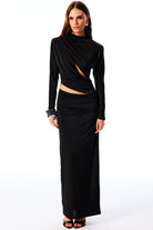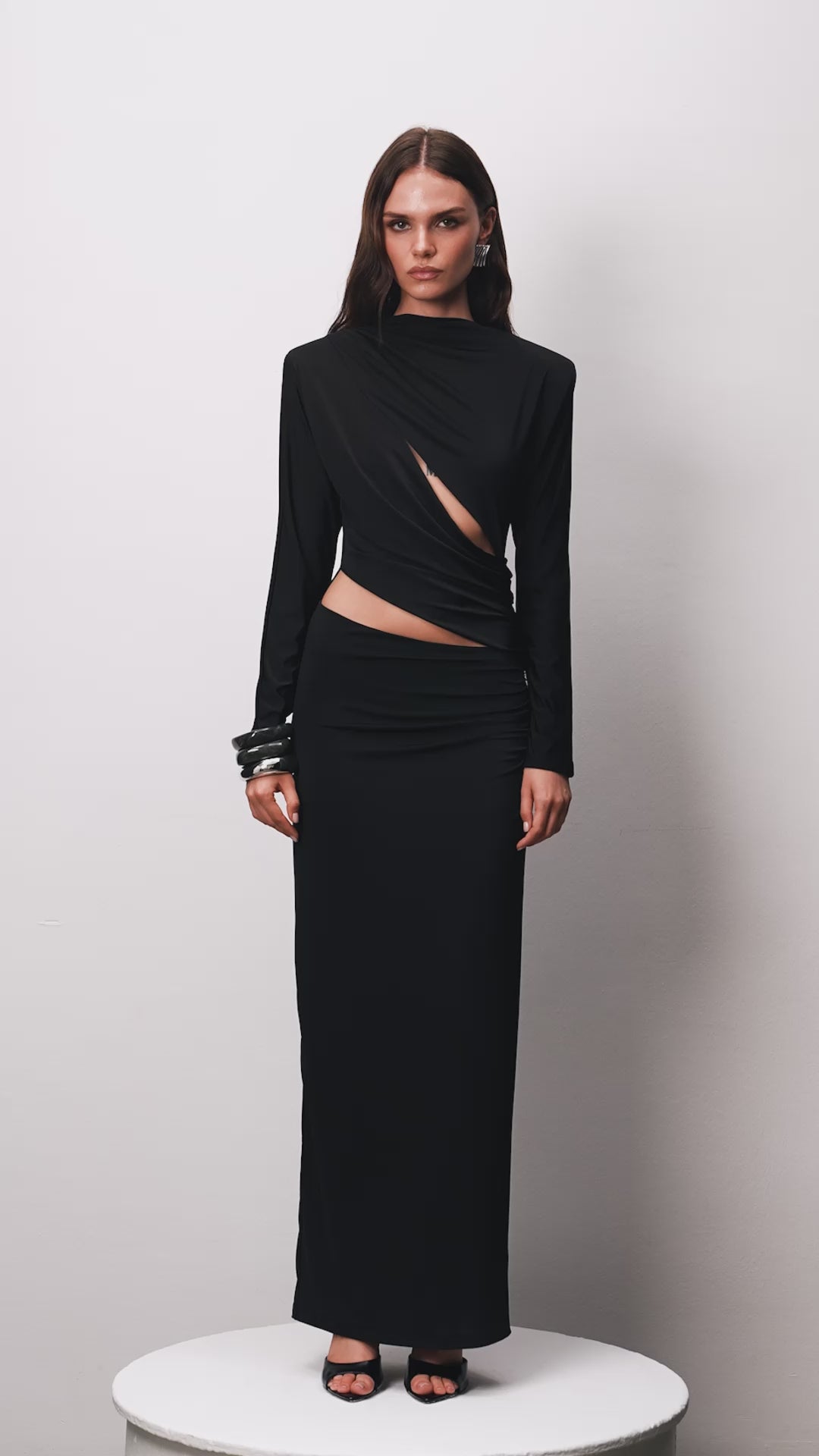 ALTHERIA Collection | Uzun kollu, asimetrik kesimli maxi elbise. Drapeli detaylar ve cut-out tasarım. Gizli fermuar kapamalı.
