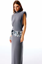 ALTHERIA Collection | Yüksek yakalı, vatkalı kolsuz uzun elbise. Bel kısmında büyük payet işlemeleriyle dikkat çeken detay. Uzun ve düz kesim eteği modern bir şıklık sunar.
