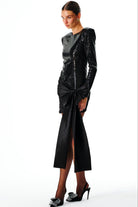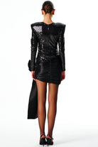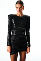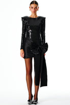 Rendez-Vous Collection | Bisiklet yaka ve uzun kollu payetli kısa elbise, büzgülü tafta etek. Fiyonk detayı çıt çıtlıdır, çıkarıp takılabilir.