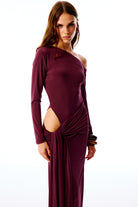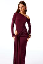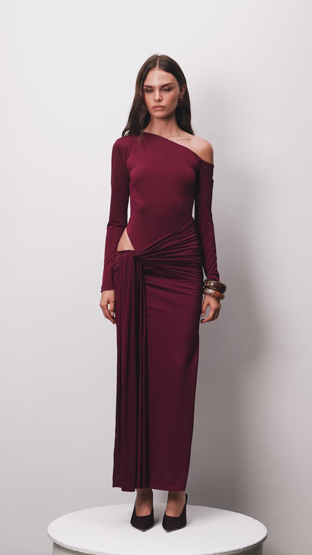 ALTHERIA Collection | Uzun kollu, uzun elbise. Asimetrik yaka, dar kesim siluet. Ön bel kısmında drapeli bağlama detayı. Maxi boy.