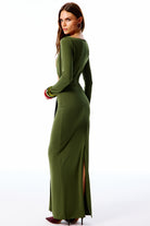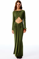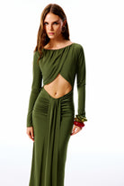 ALTHERIA Collection | Uzun kollu, göbek kısmı açık elbise. Drapeli detaylı, vücuda oturan maxi boy tasarım.