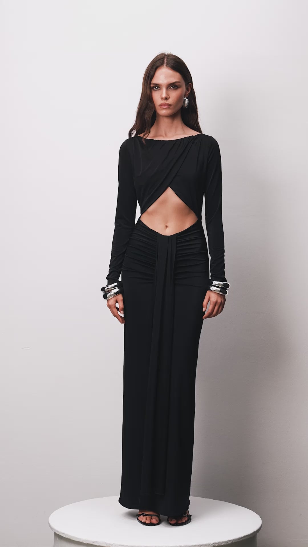 ALTHERIA Collection | Uzun kollu, göbek kısmı açık elbise. Drapeli detaylı, vücuda oturan maxi boy tasarım.