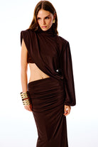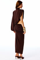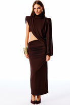 ALTHERIA Collection | Asimetrik kesimi, tek omuz uzun kollu detayı ve drapeli uzun elbise. Aynı renk sütyen ile beraber gelmektedir.
