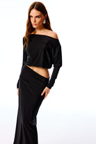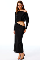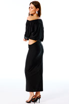 ALTHERIA Collection | Beli pencere detaylı, yarasa kollu, kayık yaka, bluzan düşük uzun elbise.