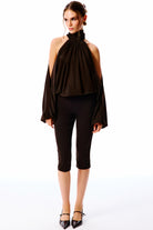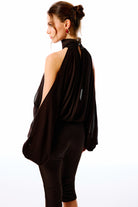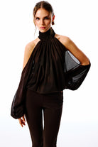 The Office Drop | Yüksek dik yakalı, transparan uzun kollu body. Kol detayları açık omuzlu. Ön kısmı drapeli, bol dökümlü.