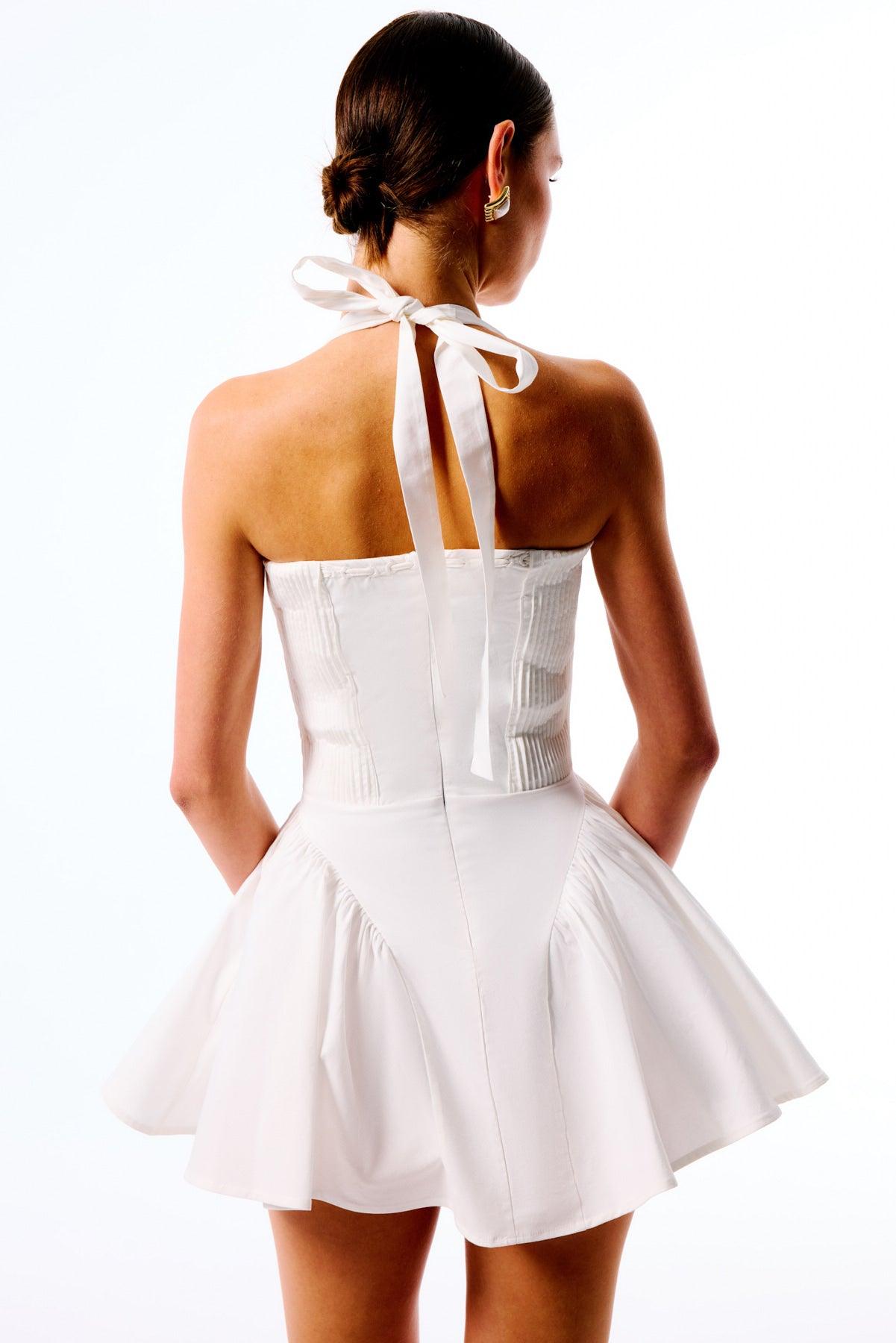 The Romantic Drop | Boyundan bağlamalı, mini boy elbise. Göğüs kısmında büzgü ve uzun bağcık detayı bulunur. Belden oturtmalı yapısı korse formunda tasarlanmış olup bedeni sararak feminen bir siluet oluşturur. Alt kısmı kloş etek formundadır. Sırt kısmı açık tasarımlıdır. Kalıbı normale göre dardır, tercih edeceğiniz bedeni buna göre seçmeniz önerilir.