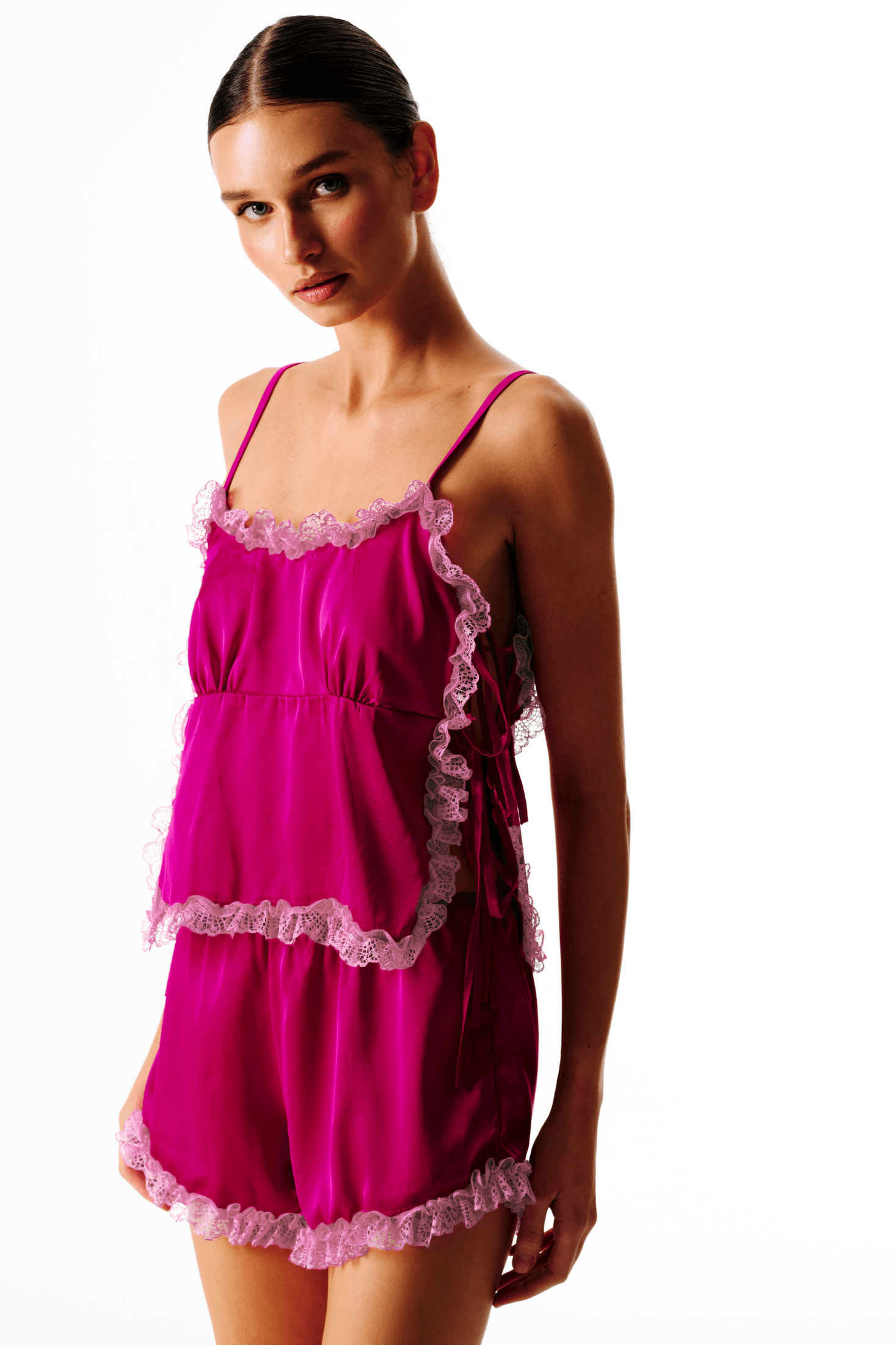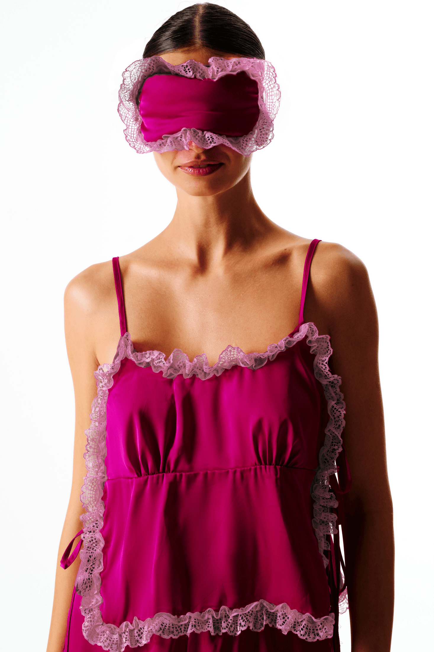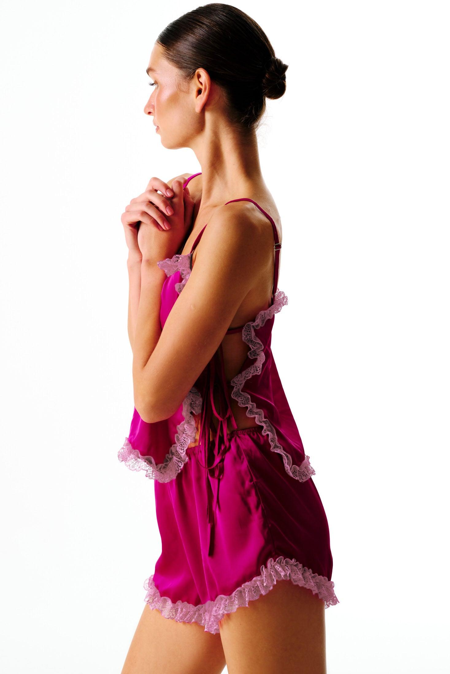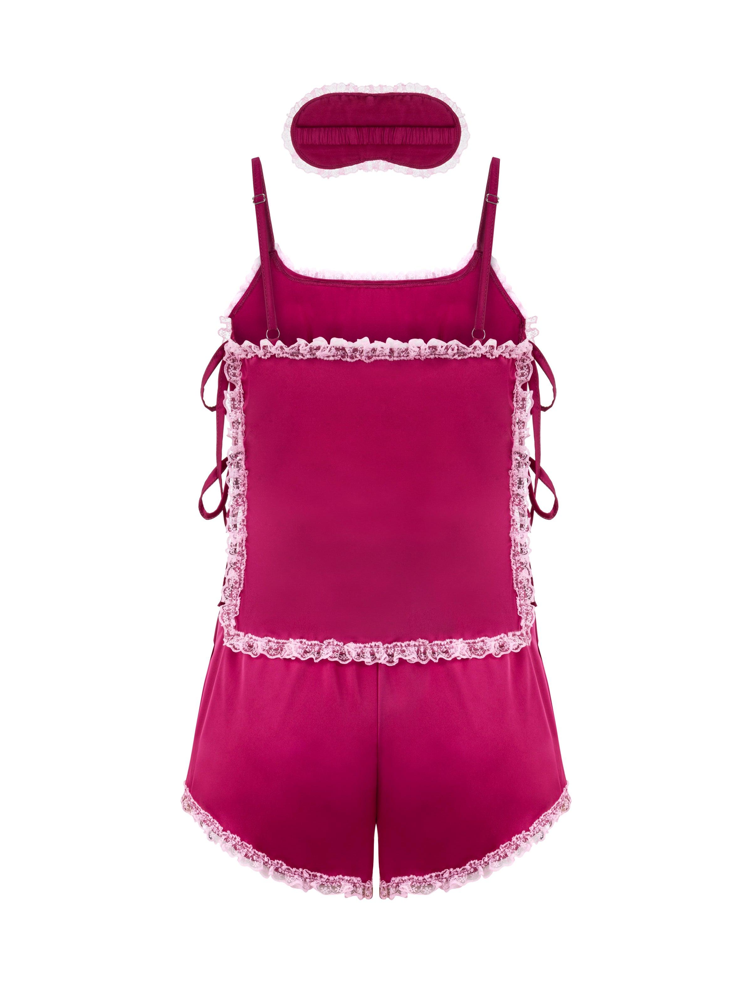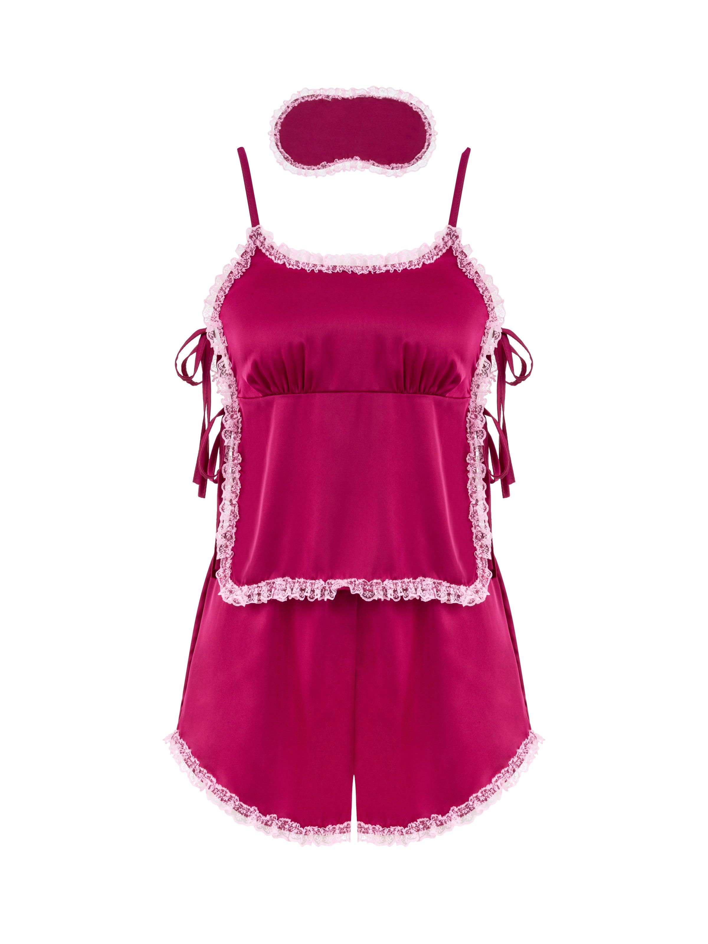 Berry Me In Love Collection | İnce askılı, dantel detaylı saten pijama takımı. Üst kısmı hafif büzgülü, yanlardan bağcıklı tasarımıyla feminen ve romantik bir görünüm sunar. Şortu rahat kesimli olup, kenarları zarif dantellerle süslenmiştir. Set, uyumlu saten göz bandıyla tamamlanarak şıklık ve konforu bir araya getirir.