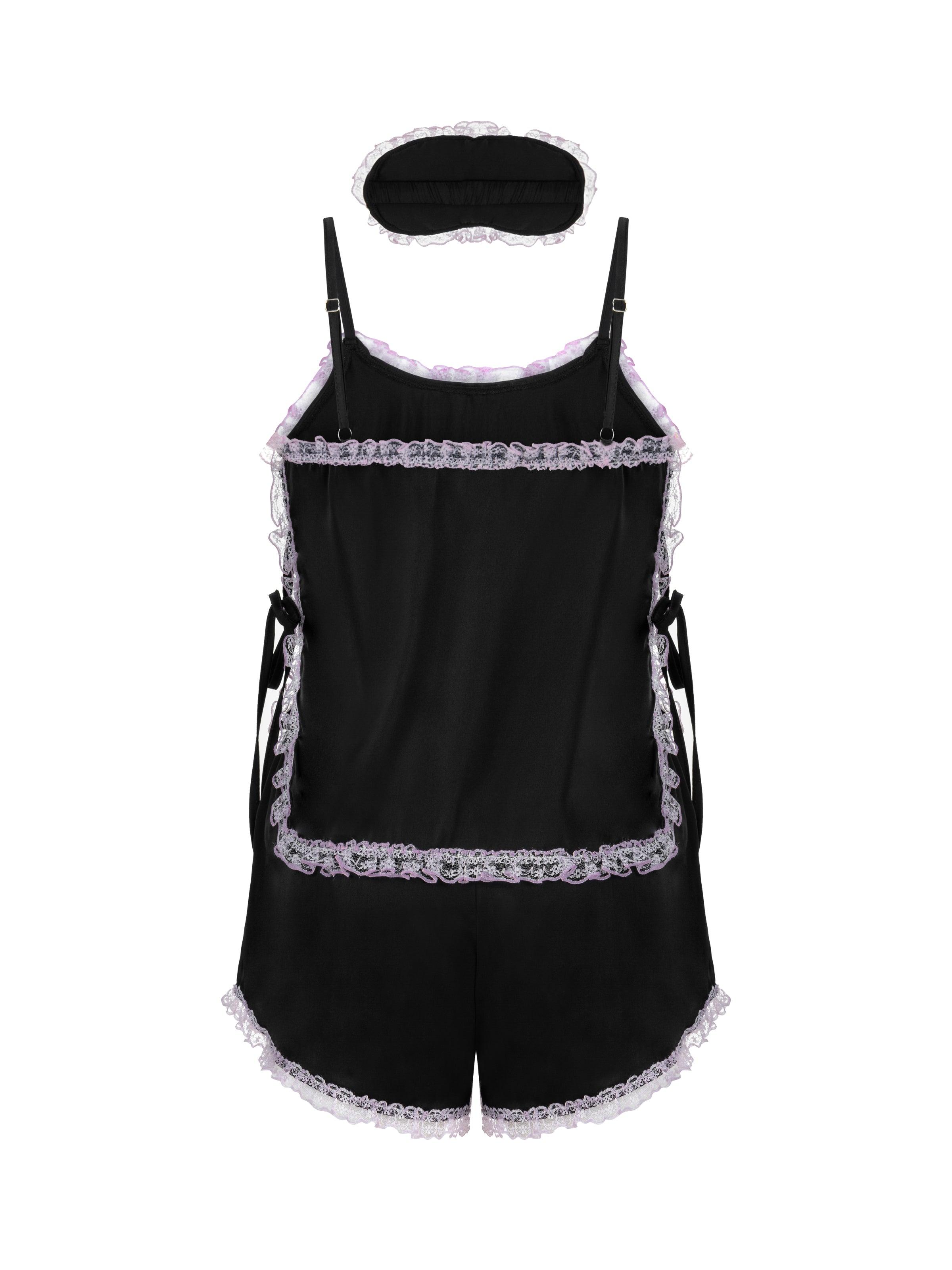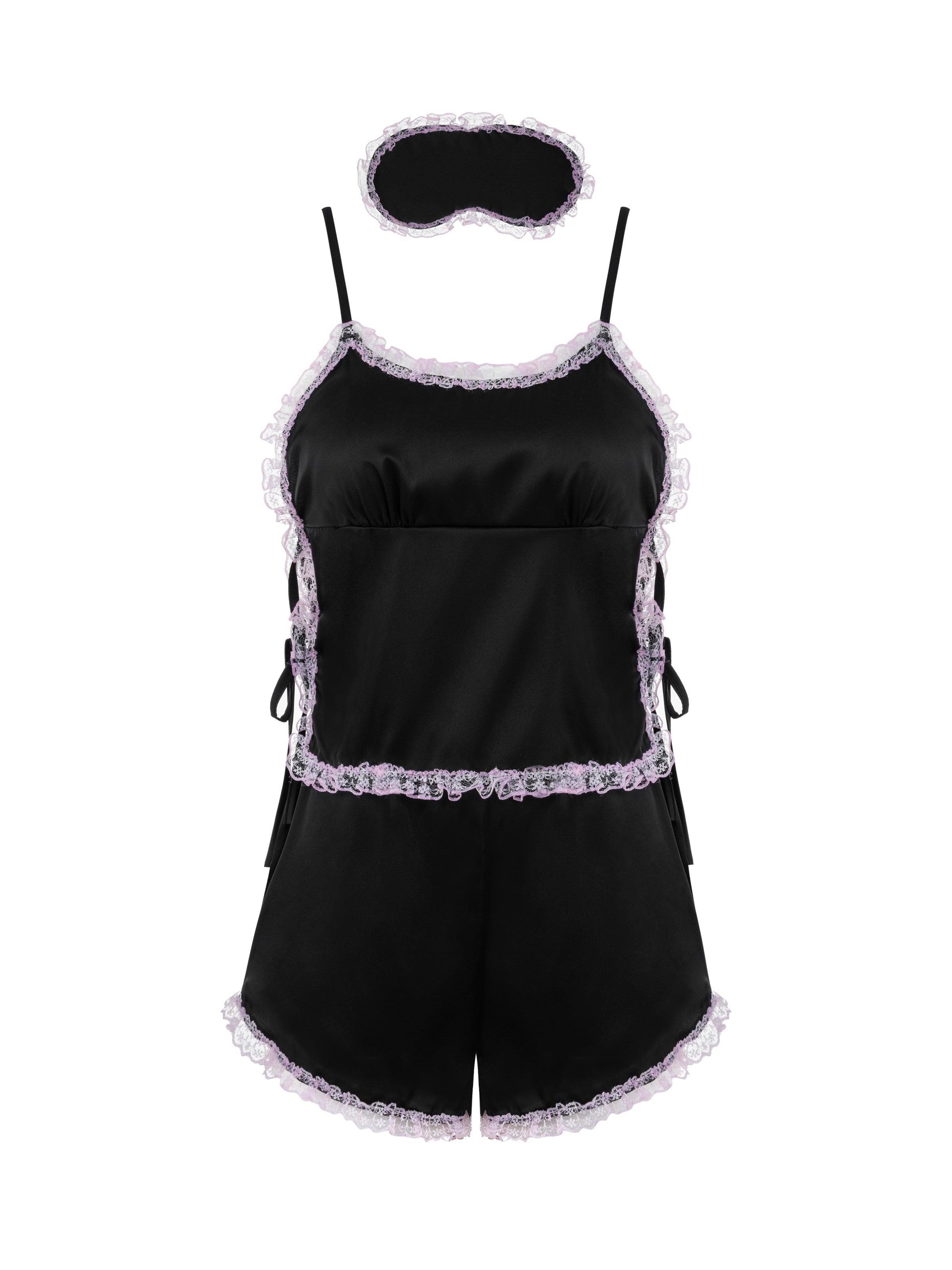 Berry Me In Love Collection | İnce askılı, dantel detaylı saten pijama takımı. Üst kısmı hafif büzgülü, yanlardan bağcıklı tasarımıyla feminen ve romantik bir görünüm sunar. Şortu rahat kesimli olup, kenarları zarif dantellerle süslenmiştir. Set, uyumlu saten göz bandıyla tamamlanarak şıklık ve konforu bir araya getirir.