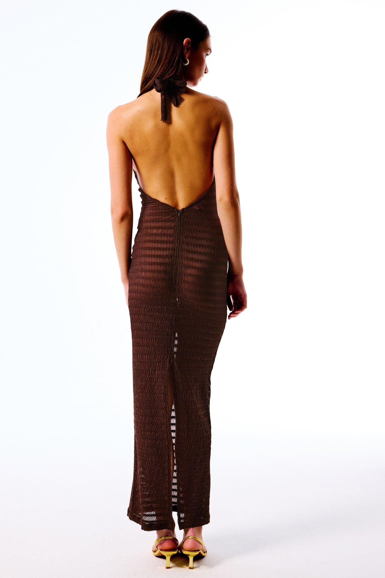 Thalita Collection | Halter yaka, boyundan bağlamalı, ön göğüs kısmı boncuk detaylı, arkası açık, astarsız, triko elbise.